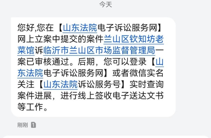 法院短信通知立案审核已通过(当事人供图)