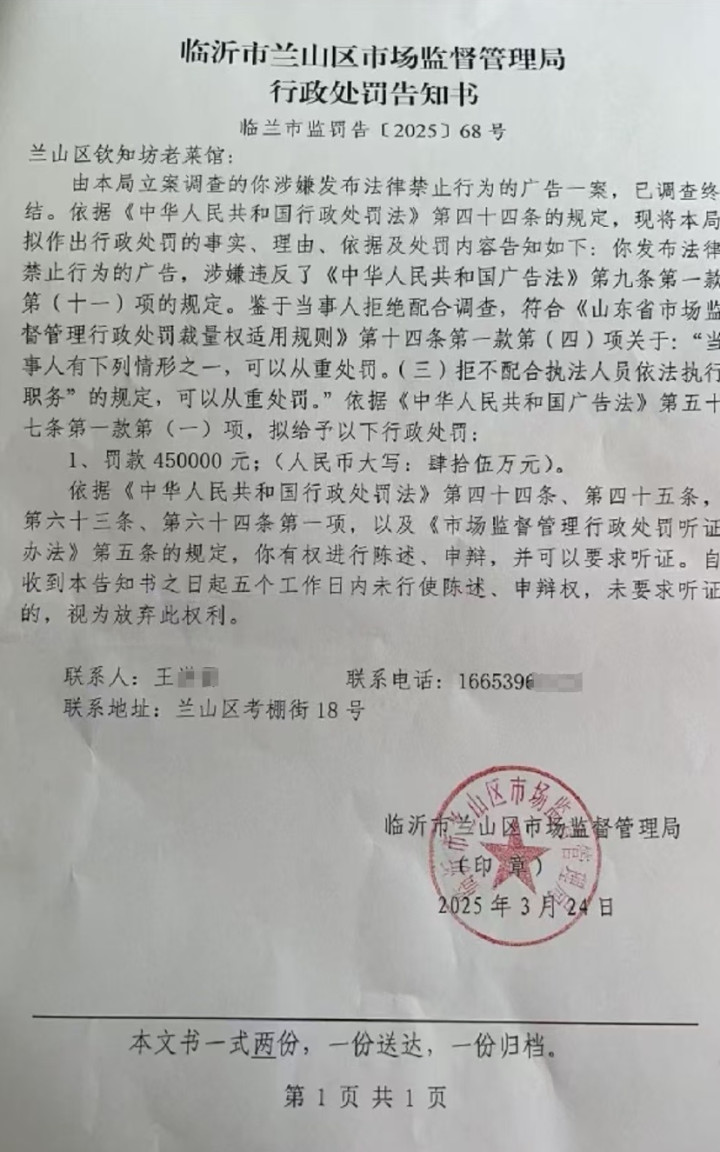 但令她没想到的是,还没等她去接受调查,3月24日,一纸《行政处罚告知书》通过门缝被塞进了饭店。《告知书》上写明,饭店涉嫌发布法律禁止行为的广告,且当事人拒绝配合调查,可以依法重罚,所以拟对饭店罚款45万元。